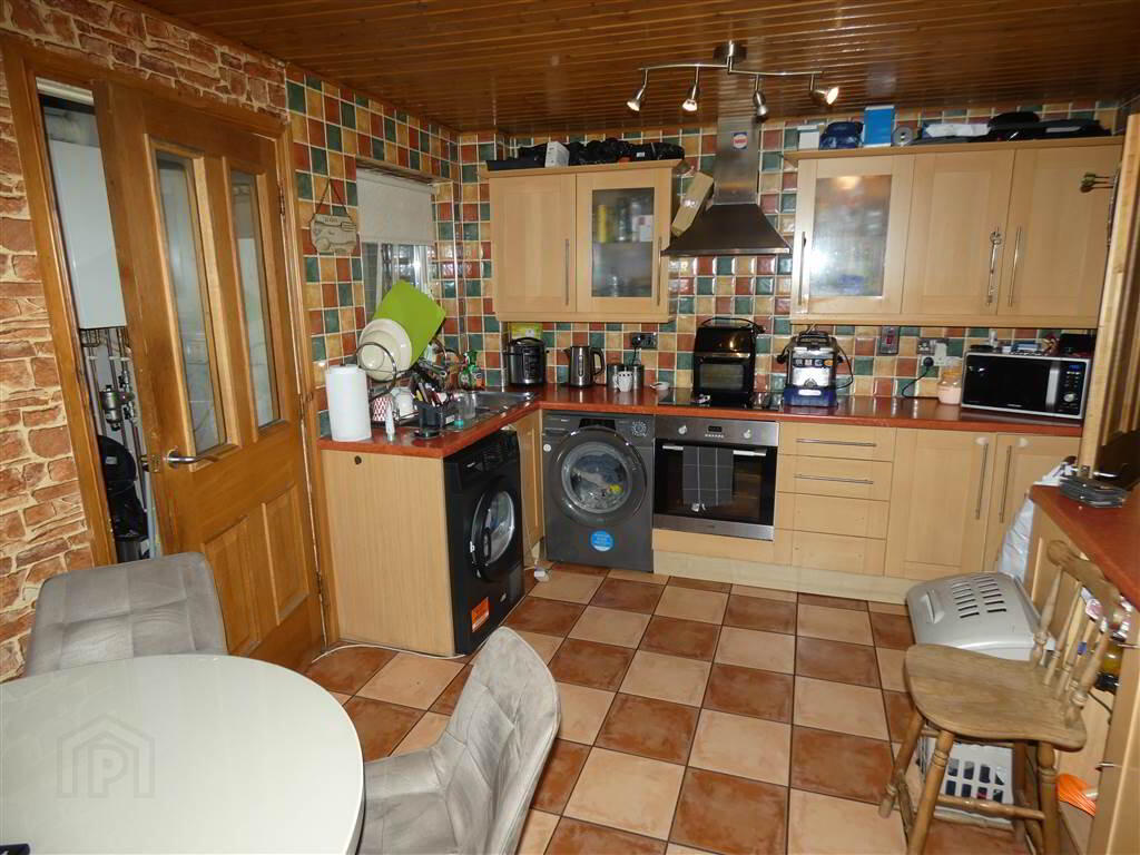 Range of high & low level units, 1.5 bowl stainless steel sink unit with mixer tap, plumbed for washing machine, 'Logik' underbench stainless steel oven, 4 ring electric hob, integrated fridge/freezer, partially tiled walls, ceramic tiled floor, tounge and groove pine ceiling, large understair storage cupboard. - REAR HALLWAY: