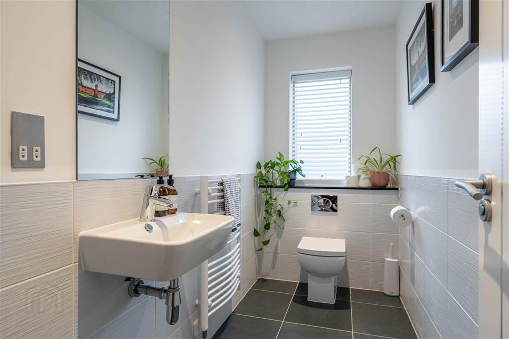 State of the art locally manufactured high & low level units with sleek semi concealed handles and underside downlighting, 1.5 bowl stainless steel sink unit with water filter tap, 'Bosch' oven, hob & microwave, concealed extractor fan, integrated dish washer and fridge/freezer, good sized feature island with stunning quartz stone worktop. - CLOAKROOM/W.C.: