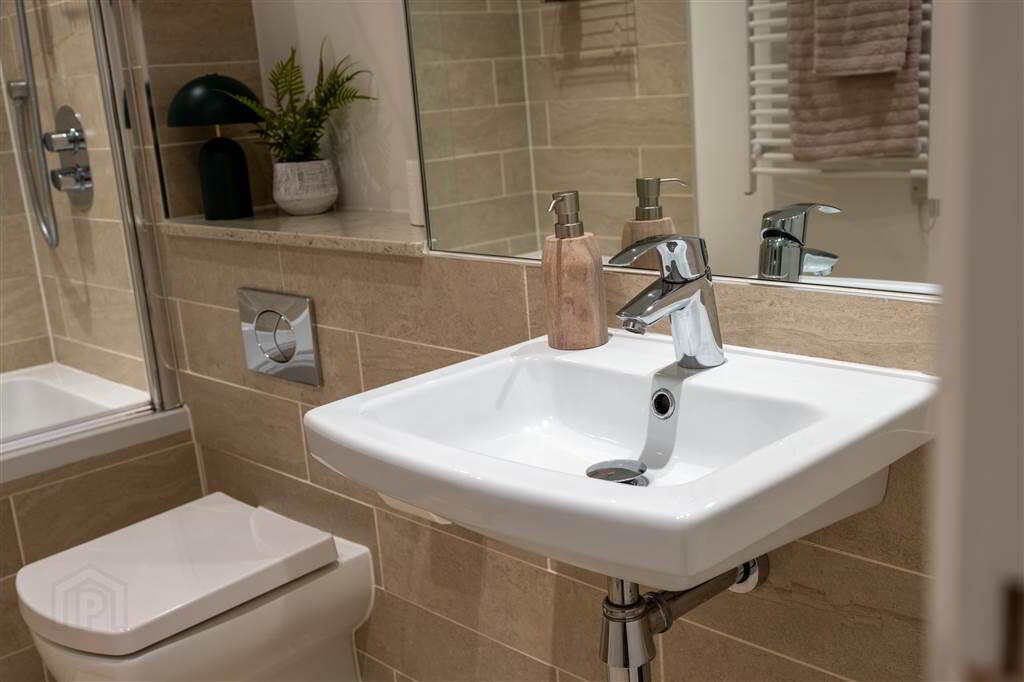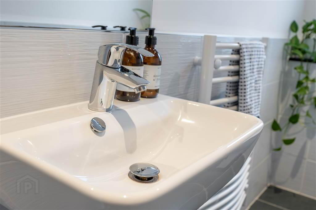 - Saneux sanitary ware with concealed cistern w.c. with soft close seat, wash hand basin, feature wall and floor tiling.