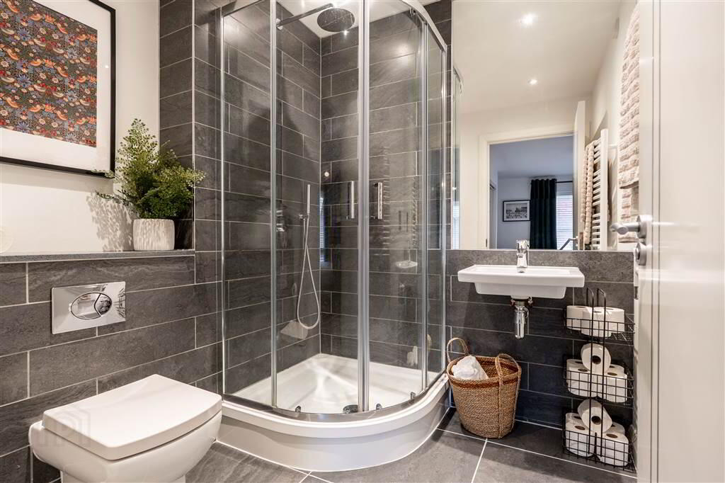 Saneux sanitary ware with large shower tray, Vado rain shower with hand attachment, glazed screen, concealed cistern w.c. with soft close seat, wash hand basin, shaving socket, electric heated towel rail, feature wall and floor tiling. - BEDROOM (2):