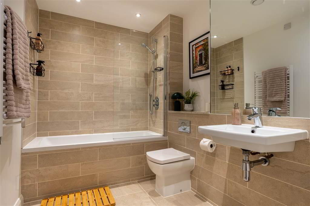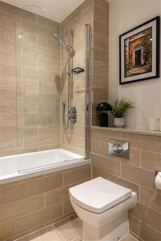 Luxury suite comprising panelled bath with Vado rain shower with separate controls over, concealed cistern w.c. with soft close seat, wash hand basin, shaving socket, electric heated towel rail, feature wall and floor tiling.