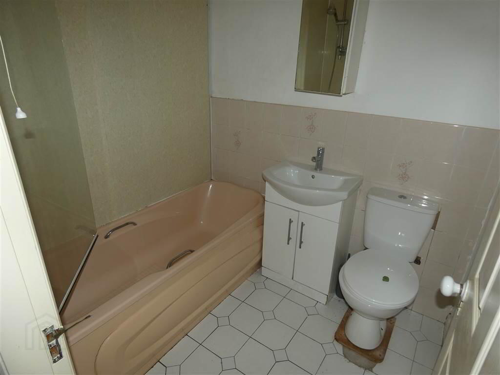 Mixed suite comprising panelled bath with 'Triton' electric shower and glazed screen over, vanity unit, close coupled w.c., part panelled walls, ceramic tiled floor.