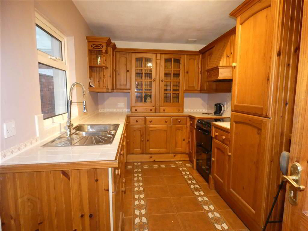 Ceramic tiled floor, partially tilled walls, double panelled radiator, 1 1/2 bowl stainless steel sink unit with mixer tap, tile work surface, extensive range of high and low level units, built in fridge freezer, extractor hood, breakfast bar, under stairs storage cupboard.