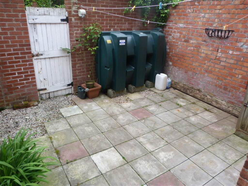 Enclosed rear yard with patio area, raised flower beds, pvc oil tank, boiler house containing oil fired boiler.