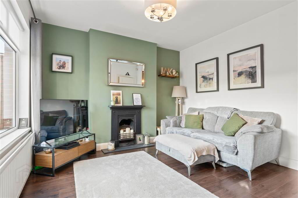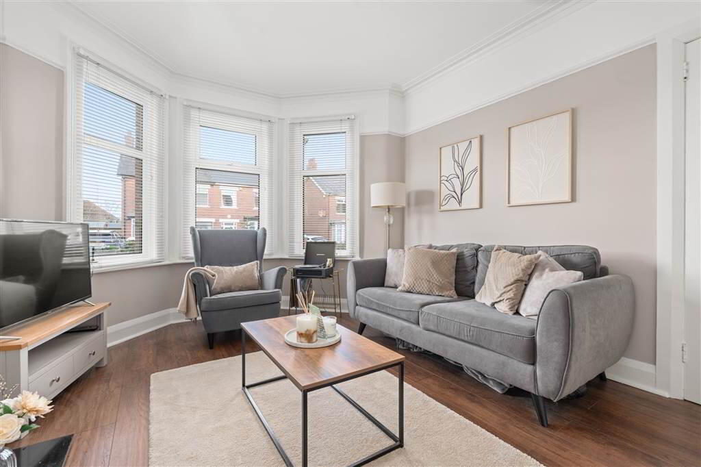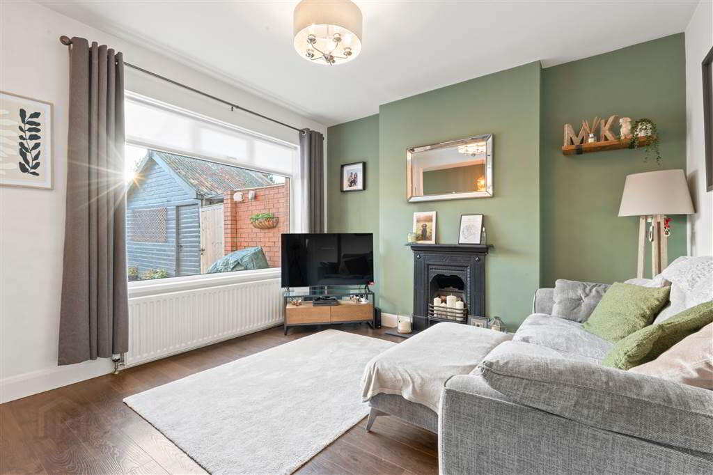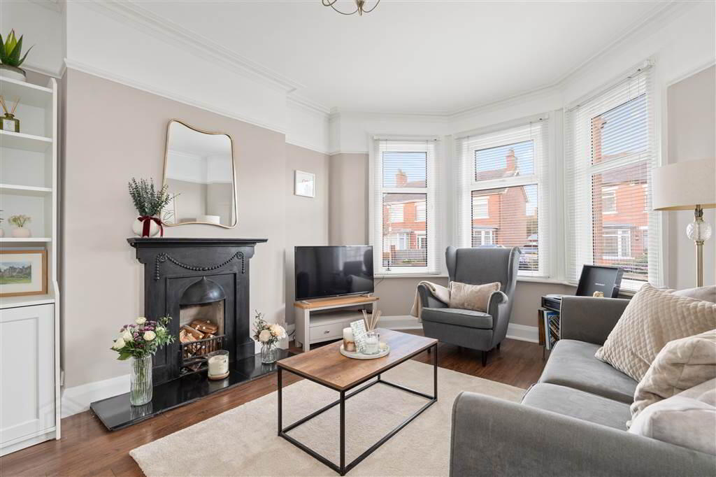 Feature bay window, period cast iron open fireplace with tiled hearth, laminate dark oak timber effect flooring, corniced ceiling and picture rail. - FAMILY ROOM: