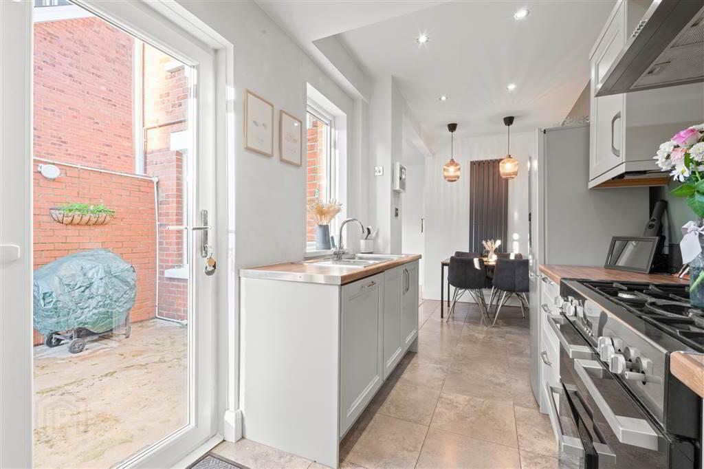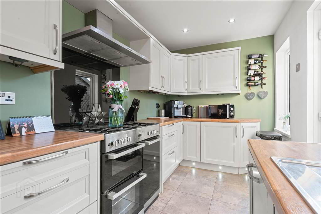 Extensive range of modern cream high & low level units, 1.5 bowl stainless steel sink unit with mixer tap, 'Belling' range cooker with double oven, grill and 5 ring gas hob, stainless steel extractor hood over, plumbed for fridge/freezer, integrated dishwasher, wall mounted vertical radiator, recessed spotlighting, ceramic tiled floor, Upvc glass panelled door to rear.