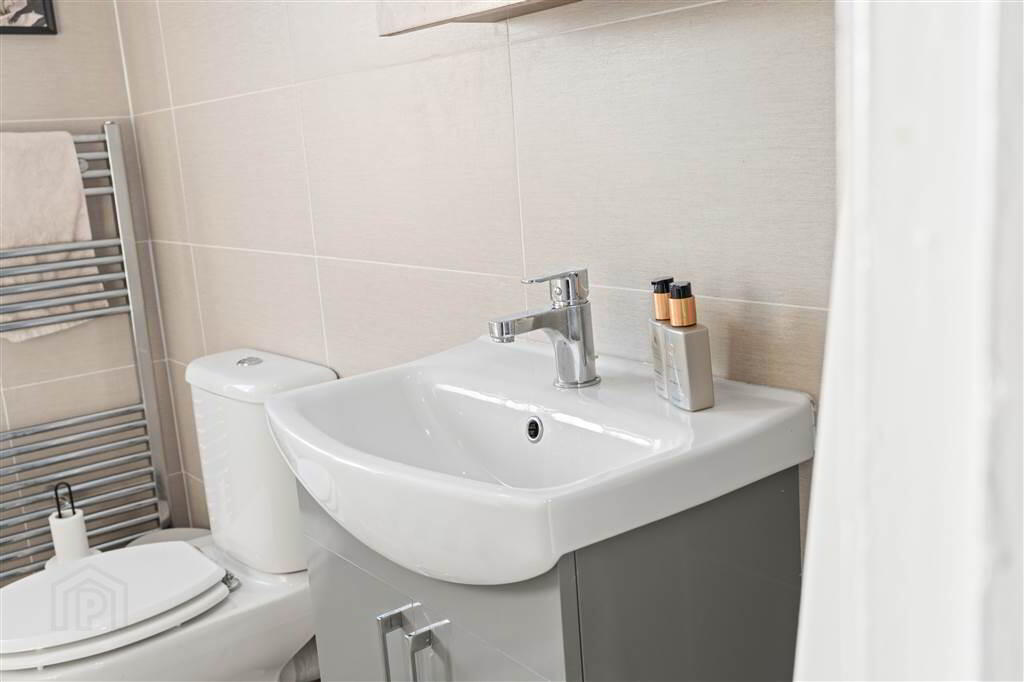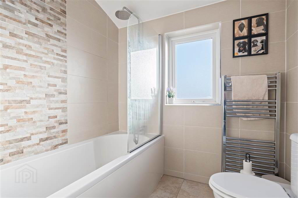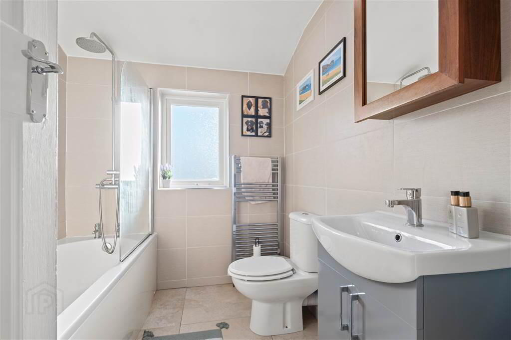 - Contemporary white suite comprising panelled bath with thermostatic controlled shower and glazed panel over, vanity unit, close coupled w.c., fully tiled walls, ceramic tiled floor, recessed spotlighting, chrome towel radiator, access to partially floored roofspace.