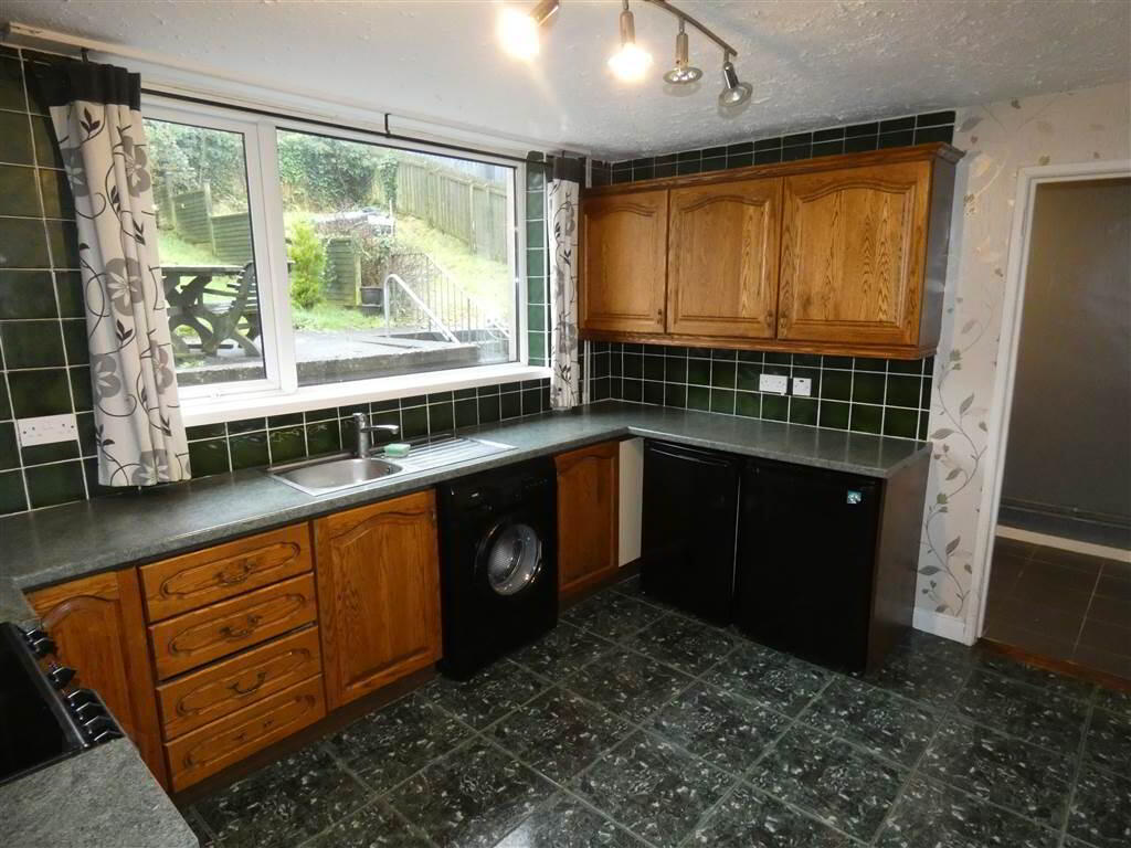 Range of high & low level units, single drainer stainless steel sink unit with mixer tap, cooker point with extractor fan over, plumbed for washing machine, ceramic tiled floor, partially tiled walls, glass panelled door to: